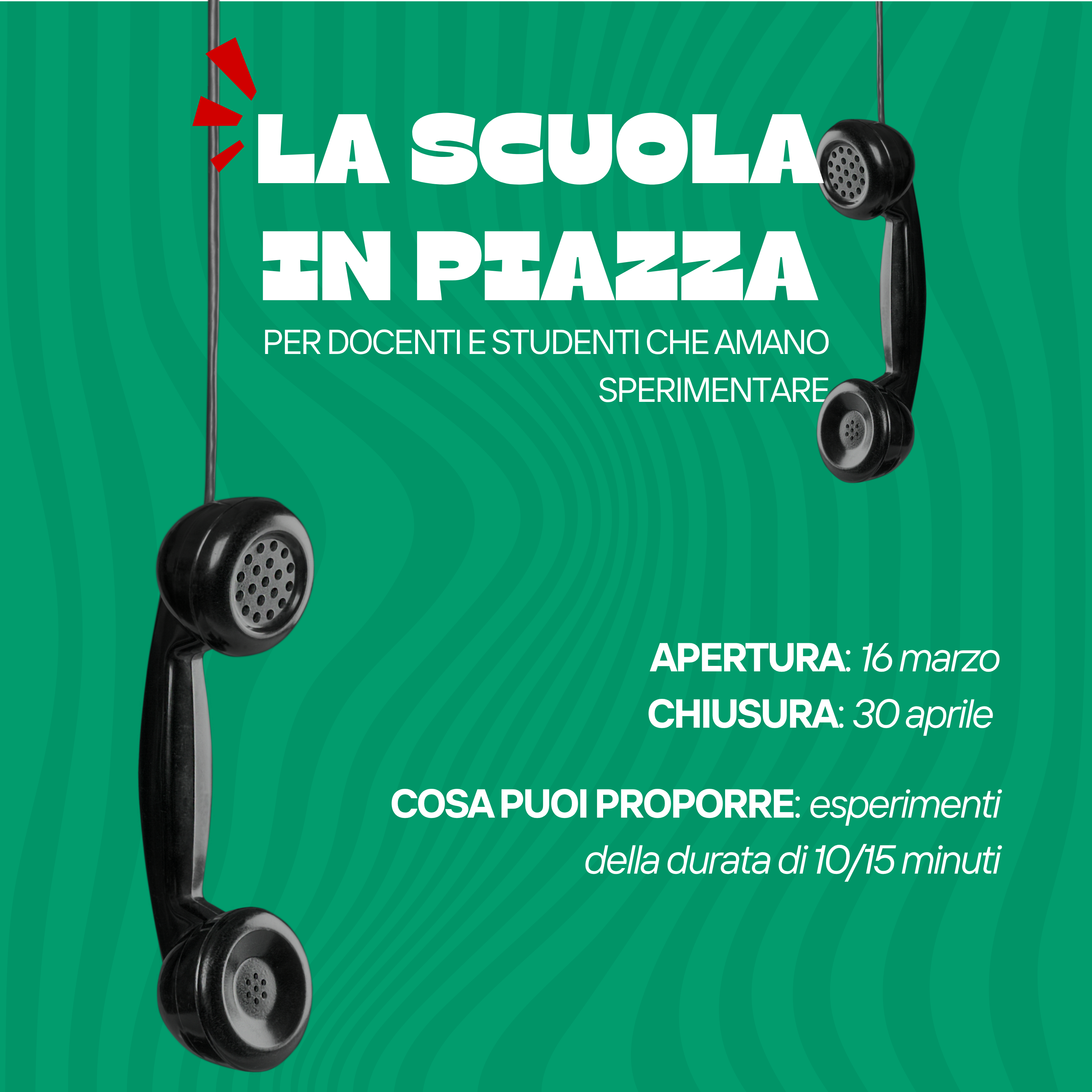 La Scuola in Piazza rappresenta, per scuole e studenti, un’occasione di mostrare al pubblico come sia possibile fare scienza in classe in modo rigoroso ma divertente e coinvolgente. La partecipazione è aperta a tutte le scuole interessate, che potranno proporre esperimenti scientifici e attività laboratoriali in forma semplificata e della durata di 10/15 minuti, adatta a essere fruita da un pubblico eterogeneo.
